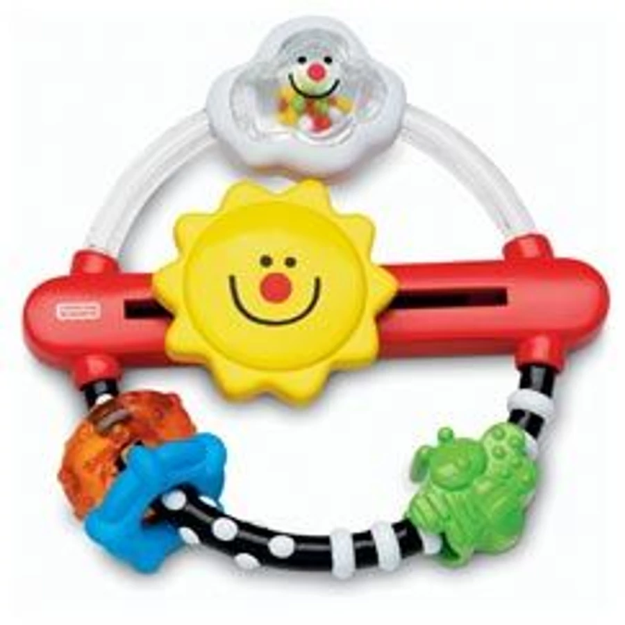 A gyűrű egyik felében átlátszó gyöngyök vannak, melyek zörögnek. Amikor a baba megrázza a gyűrűt, a gyöngyök körbeszaladnak és áthaladnak egy felhőcske belsején.
